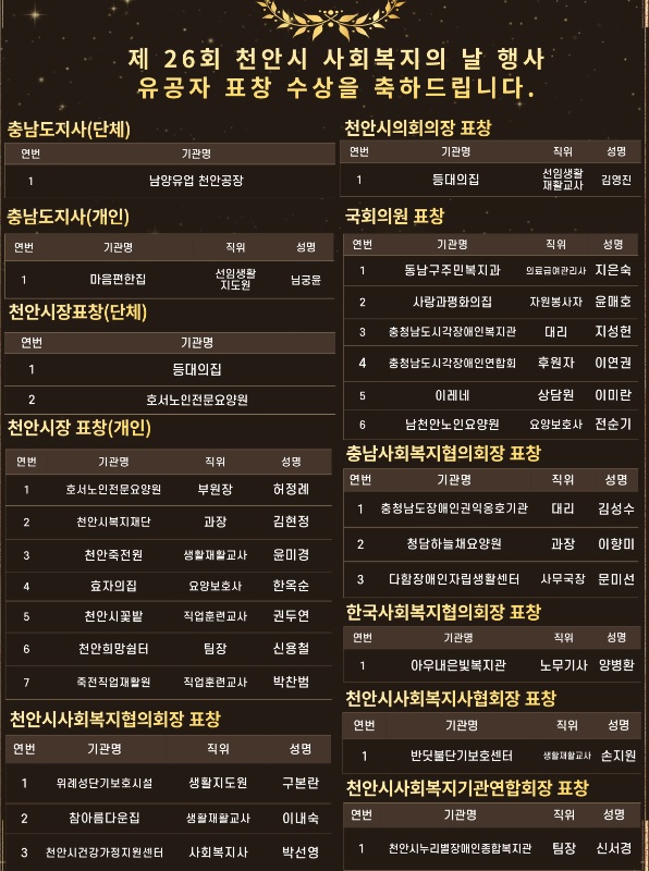 제 26회 천안시사회복지의 날 행사 유공자 표창수상 페이지 정보 작성자작성자 : 천사협 조회조회수 : 428회 작성일작성일 : 25-09-23 13:14 본문 수상을 축하 드립니다! 목록 다음글「제26회 천안시사회복지의 날 행사」사회복지 유공자 추천 협조 요청 25.07.28